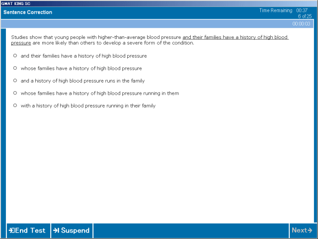 - GMAT KINGの演習途中でサスペンドアイコンをクリックするとその時点までのデータが記録され、その問題プールを後で再開することができます。この機能によりノートPCなどで昼休みなどのちょっとした時間でも演習をすることができ、帰宅後に続きをやるなどの空き時間の有効活用ができます。