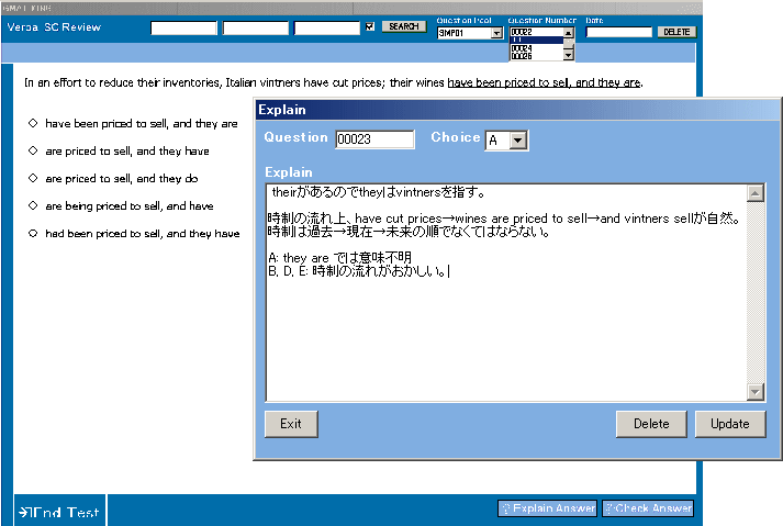 - 下の画面はSCの演習後に問題をレビューし、重要なポイントなどをメモ機能を使って記録しているところです。紙のノートと違って、メモは瞬時に呼び出せるので、何回も同じ問題をレビューする際に非常に便利で効率的です。上記の演習結果分析機能画面と同時に表示できるので、過去の演習結果の傾向を見ながら学習を進めることができます。メモは1問に1つ記録でき、自由に編集・削除可能です。Question