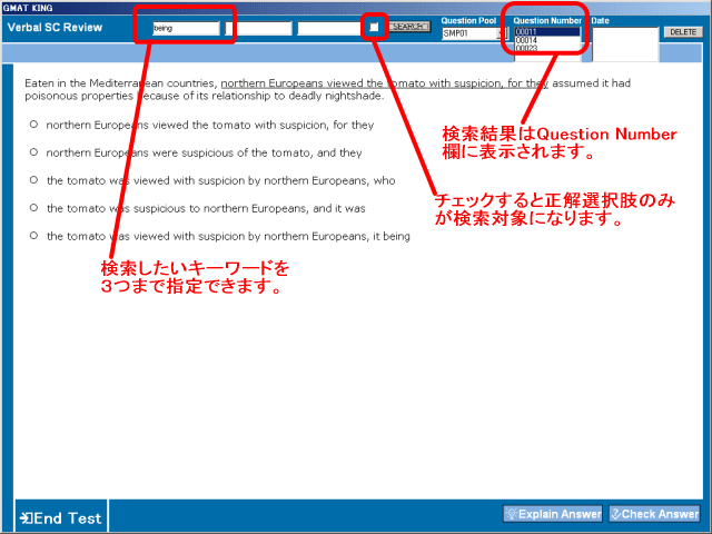 - 下の画面のようにSCレビュー画面において任意の3つまでのキーワードを含む問題だけを検索することができます。一発切りキーワードの検証などに活用できます。演習結果分析機能と合わせて、特定のキーワードで不正解が多い場合にはその分析に役立ちます。