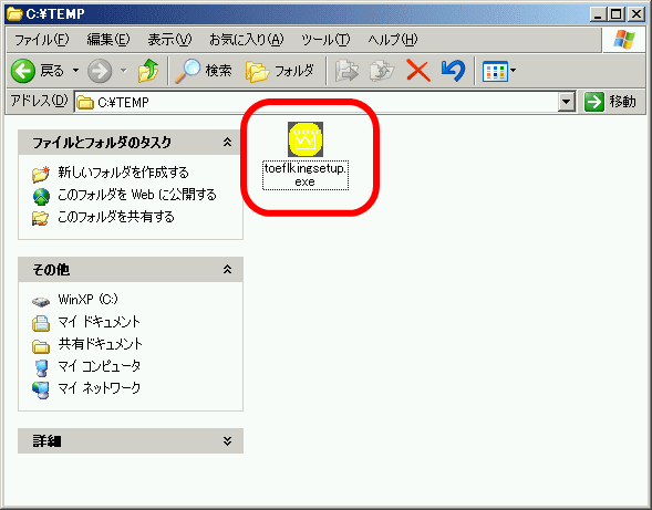 | 1 | 任意のディレクトリにダウンロードしたtoeflkingsetup.exeをエクスプローラからダブルクリックして起動します。下図の例では C:\temp ディレクトリにダウンロードした toeflkingsetup.exe を起動しています。![]() 自動的にPCにWindowsインストーラが入っているか調べ、Windowsインストーラが無い場合にはインストールします。既にWindowsインストーラが入っている場合には自動的に4のTOEFLKINGのインストールの準備画面が開始されます。 ![]() |