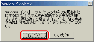 | 2 | Windowsインストーラは必要があれば次のように再起動のメッセージを表示しますので「はい」をクリックして再起動して下さい。![]() |
