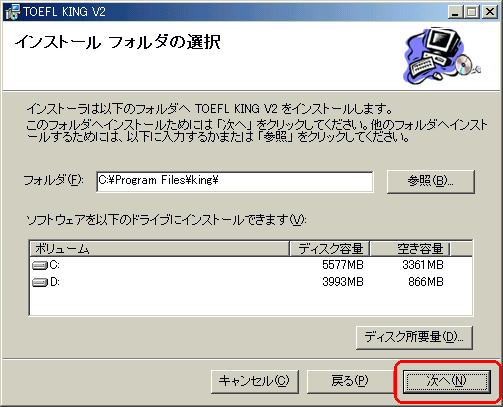 C:\Program Files\KING フォルダをそのまま使って下さい。フォルダを選んだら「次へ」をクリックします。![]() |