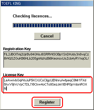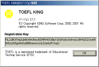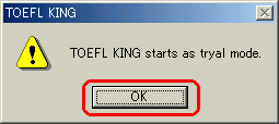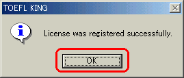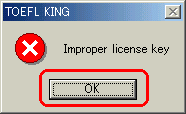 | 10 | ダウンロードしたTOEFLKINGはライセンスキー未登録なので下図のメッセージが表示されます。「OK」をクリックします。![]() |