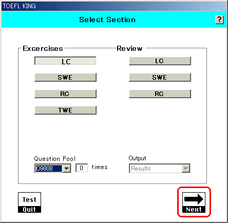 | 12 | 下図のように TOEFLKING のメインメニュー画面が出る事を確認し、LC, SWE, RC