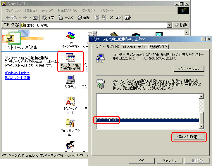 | 13 | TOEFLKINGをアンインストールするには「スタート→コントロールパネル→アプリケーションの追加と削除」の順に選択し、「TOEFLKING」を選択して「追加と削除」ボタンをクリックします。![]() |