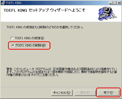 | 14 | 次の画面で「TOEFLKINGの削除」を選択し、「完了」ボタンをクリックします。![]() |